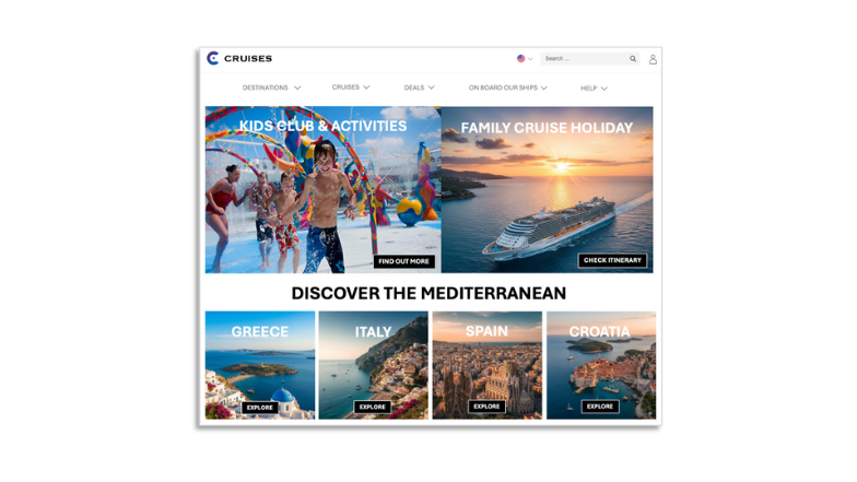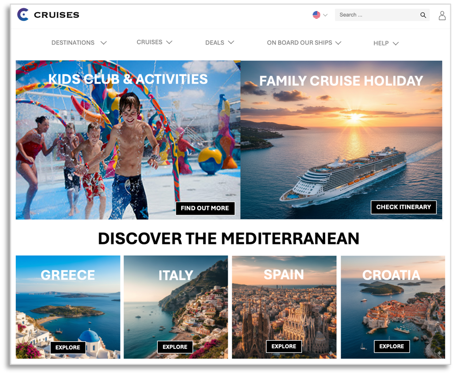 Before the Millers even book, they’re searching online for the perfect Mediterranean cruise. Instead of showing generic offers, the CoreMedia Engagement Cloud recognizes their interest in family-friendly cruises and automatically highlights options with kids’ clubs, water parks and family cabins.