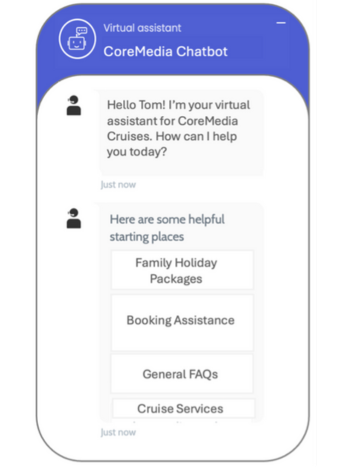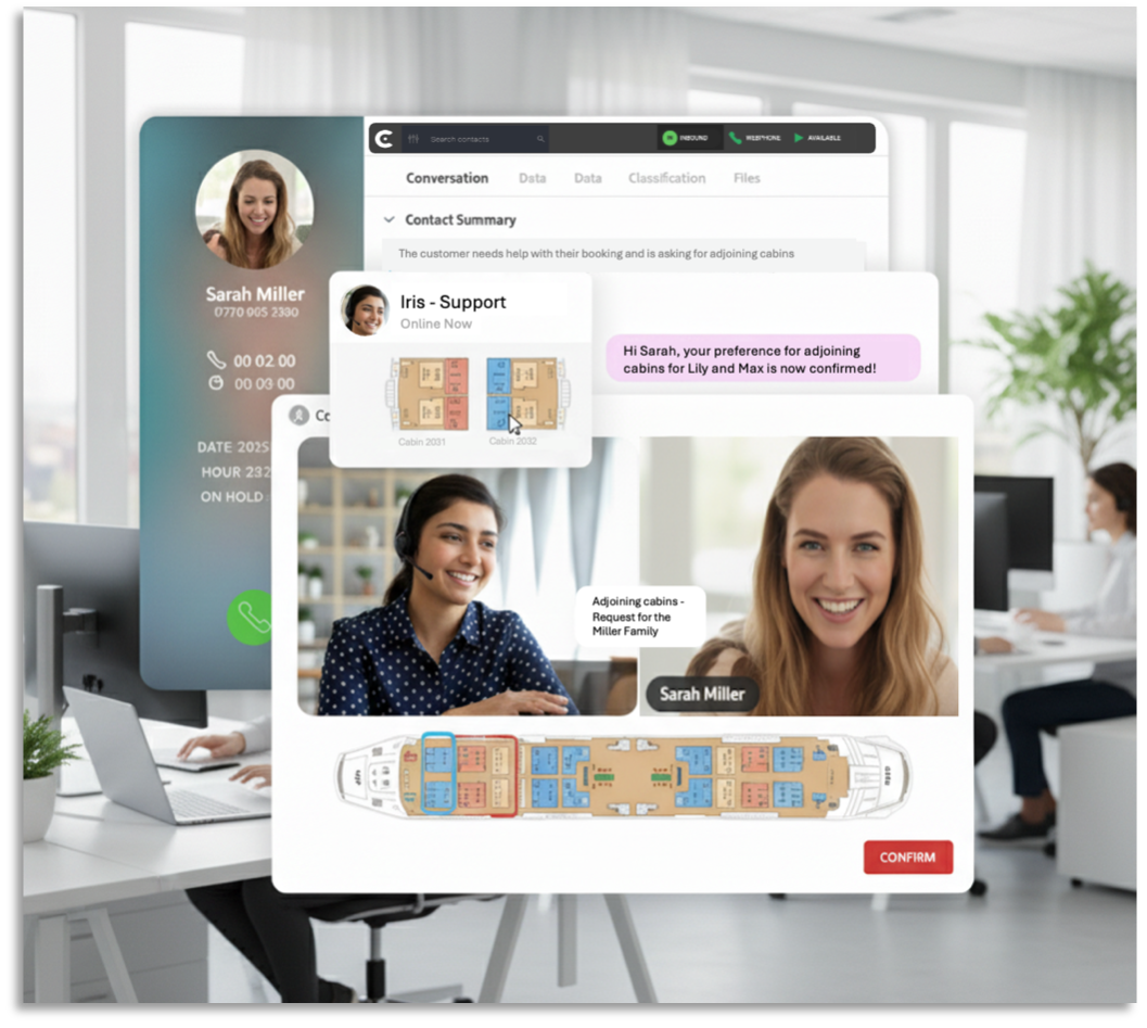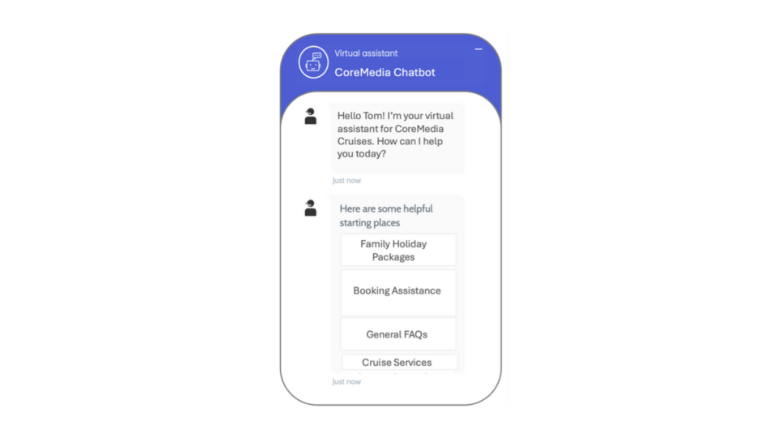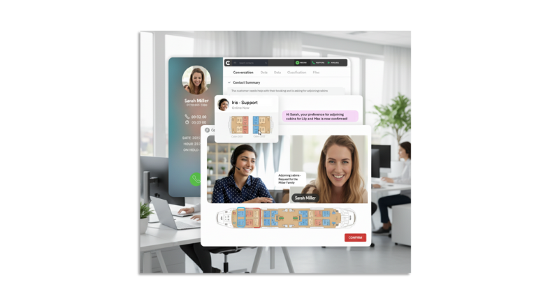 Once the trip is booked, CoreMedia Engagement Cloud shifts its focus to making their journey smooth. When Sarah struggles to request adjoining cabins during online check-in, she connects with a support agent via video call. With co-browsing, the agent quickly fixes the issue and confirms: “Your adjoining cabins for Lily and Max are ready.” That personal reassurance creates confidence before the family even boards.