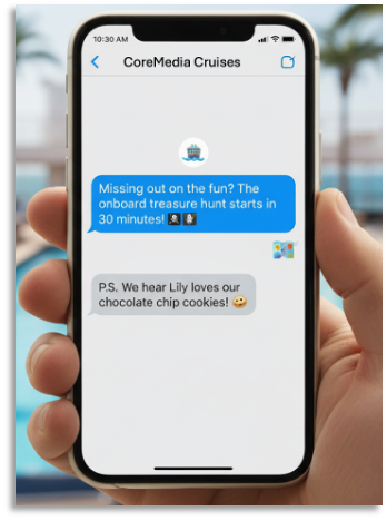 Later, while Tom relaxes onboard, a personalized SMS/push notification reminds him: “The kids’ treasure hunt starts in 30 minutes!” This proactive engagement shows the cruise line is attentive to the family’s needs and helps them make the most of their holiday.