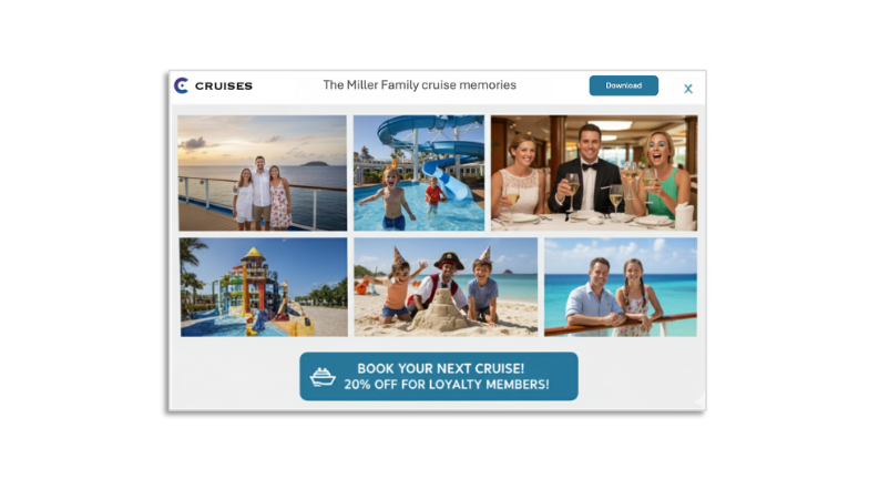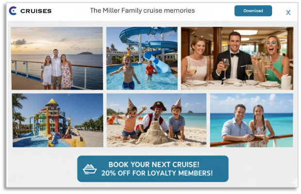A week after returning home, the Millers receive a thoughtful email: a thank-you note, a link to download their cruise photos and an exclusive discount for a future booking, this time with the grandparents. A short feedback survey adds another personal touch while giving the cruise line valuable insight that can turn one-time bookings into lasting relationships.